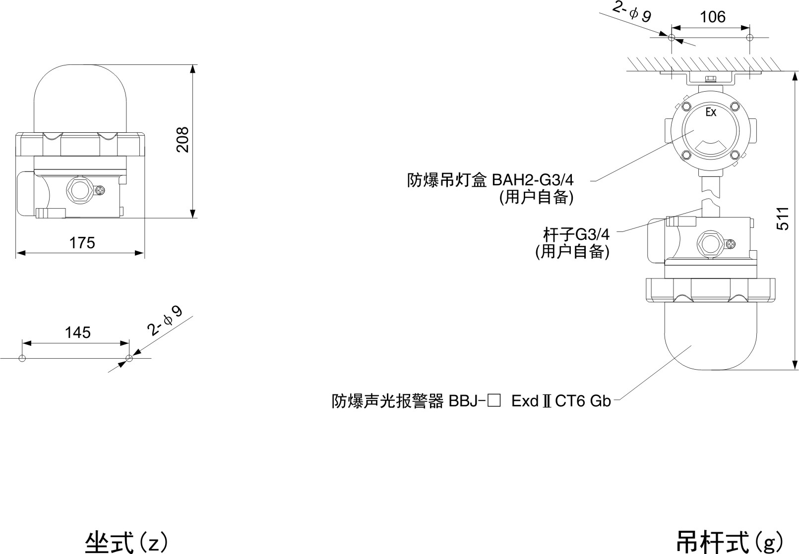 > 吊桿式出廠時,只配直桿 G3/4″(200mm),若需防爆接線盒,防爆活接頭等配件,請另外注明。