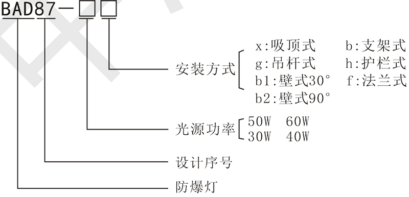 > 按照產品型號規格說明逐條選擇并注明防爆標志,例如:需要防爆 LED 燈 50W 規格,吸頂式安裝,則產品型號為 BAD87-50x ExdembⅡCT5 Gb。
